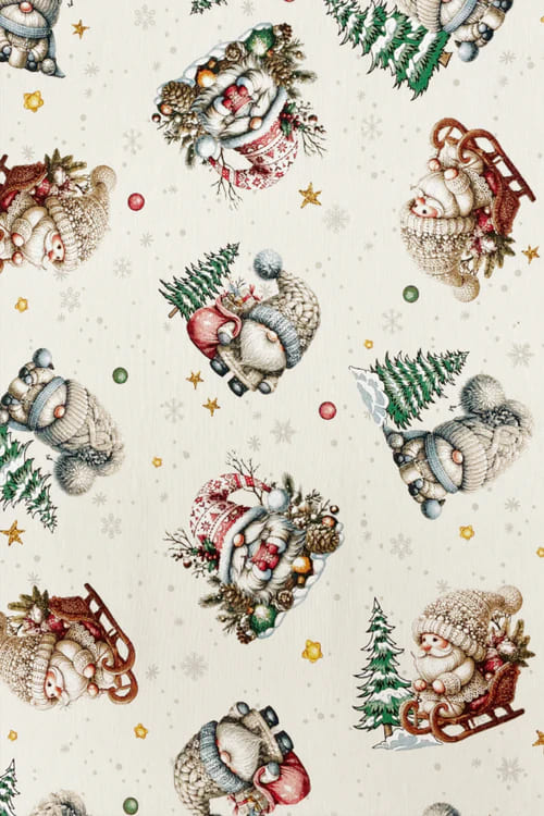 Очарователен десен с пухкави джуджета, шейни, елхички и снежинки върху светъл фон. Мотивът носи игривост, детско настроение и нежна коледна приказка. Чудесна за семейни домове, заведения, детски кътове и подаръци.