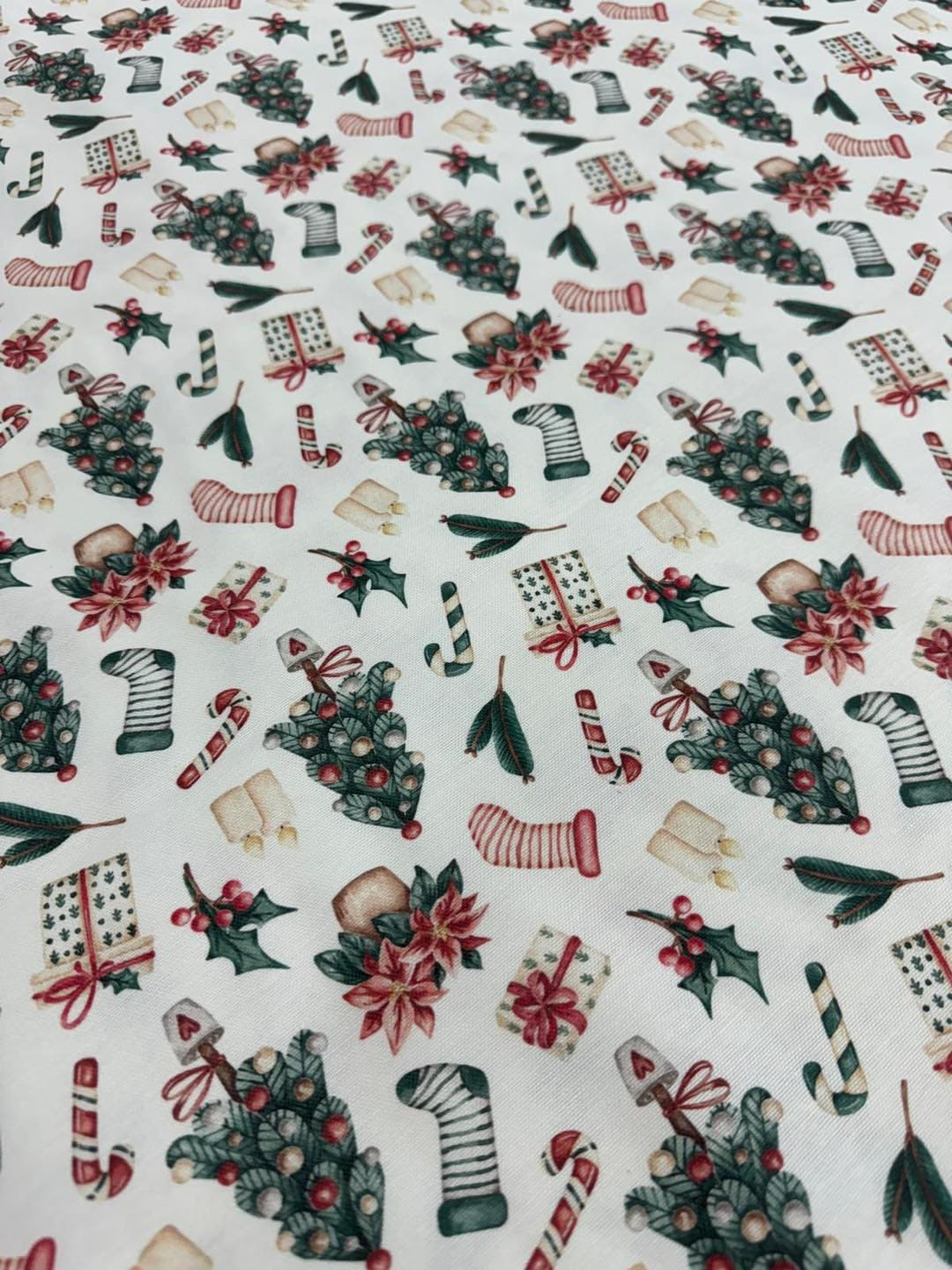 Описание: Коледна покривка за масата с хидрофобирано покритие - Празнична радост. Топъл зимен мотив с малки къщички, елхи и горски плодове, озарени от свещи и сняг. Цветовете в червено и кафяво създават уют като в коледна пощенска картичка.
