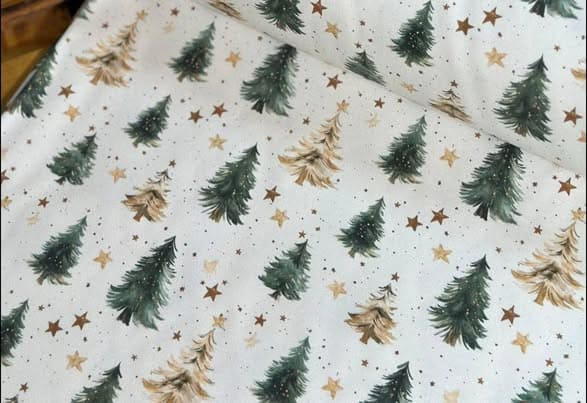 Описание: Изчистен и елегантен десен с нежни борови елхи и златни звездички върху светъл фон. Придава усещане за спокоен зимен пейзаж и е подходяща за стилна празнична трапеза.