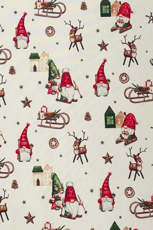 Покривка за маса Празнични джуджета впечатлява с очарователен коледен десен, изпълнен с всичко, което носи празнично настроение – симпатични джуджета, еленчета, шейни, звезди, подаръци и зимни къщички. Фонът е в топъл кремав нюанс, който подчертава детайлните илюстрации в червено, зелено и кафяво. Десенът е весел, уютен и идеален за семейна коледна атмосфера.