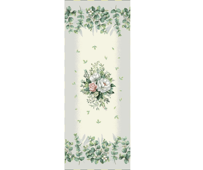 Внесете свежест и елегантност във вашия дом с този тишлайфер за маса с флорални мотиви на евкалипт и божури. Дизайнът се отличава с изящна централна композиция от бели и розови божури, обградени от деликатни евкалиптови клонки, а в краищата – плътна украса от свежа зеленина. Падналите листенца по целия десен създават усещане за движение и природна лекота. Фонът е светъл с фина преливка, която придава мекота и въздушност на визията.